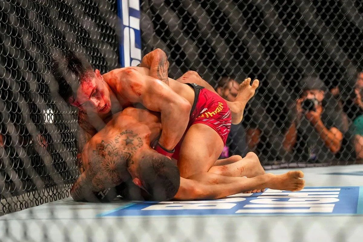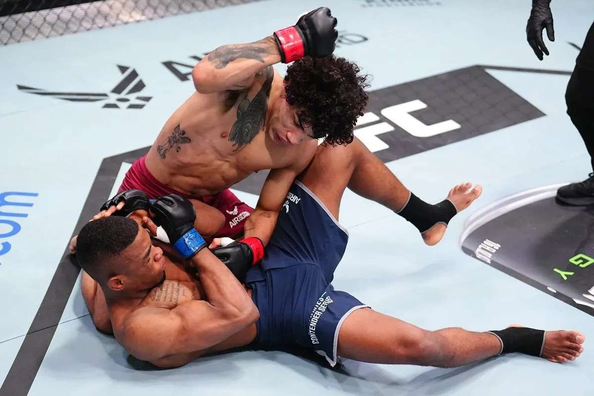 David Martínez unloads brutal ground and pound onto Saimon Oliveira. Credit: Bloody Elbow.