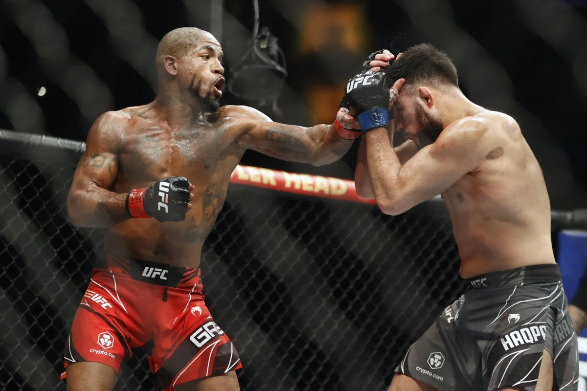 Nassourdine Imavov stuns Israel Adesanya with a lunging right hand. Credit: Zuffa LLC.
