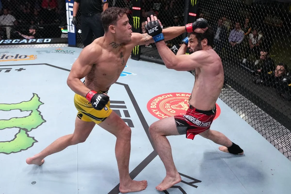 Caio Borralho blasts Gadzhi Omargadzhiev with a left hand. Credit: MMA Fighting.