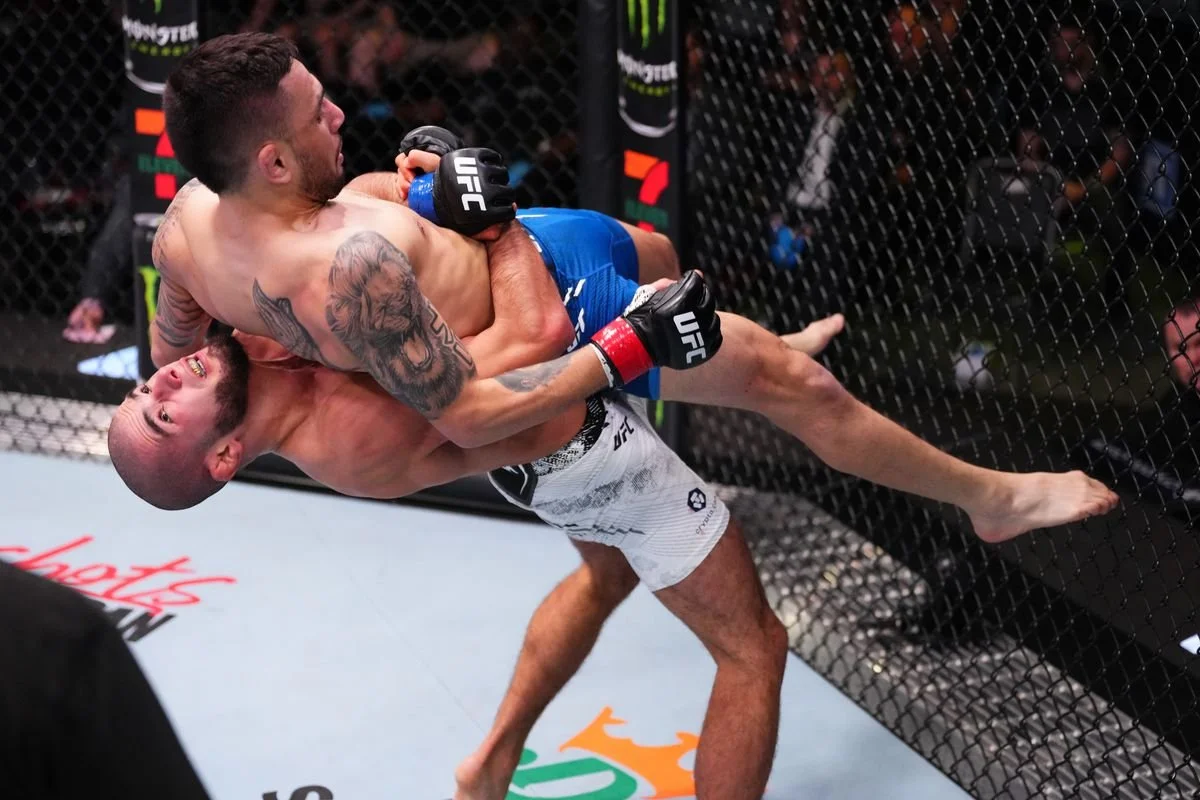Muhammad Mokaev brutally suplexes Alex Perez. Credit: MMA Fighting.