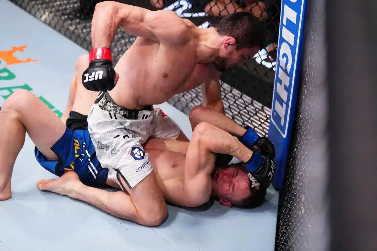 Umar Nurmagomedov postures up and batters Bekzat Almakhan with ground and pound. Credit: Zuffa LLC.