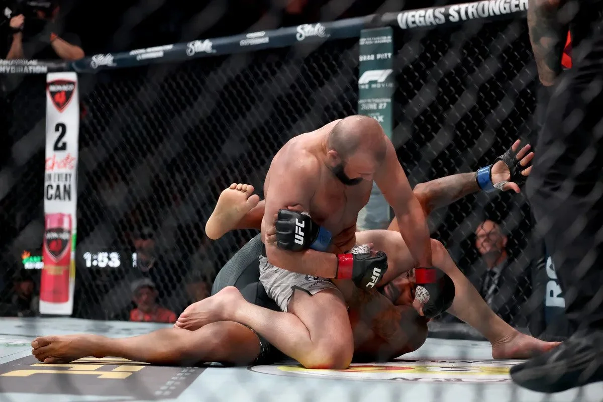 Azamat Murzakanov unloads ground and pound shots onto Brendson Ribeiro. Credit: MMA Junkie.