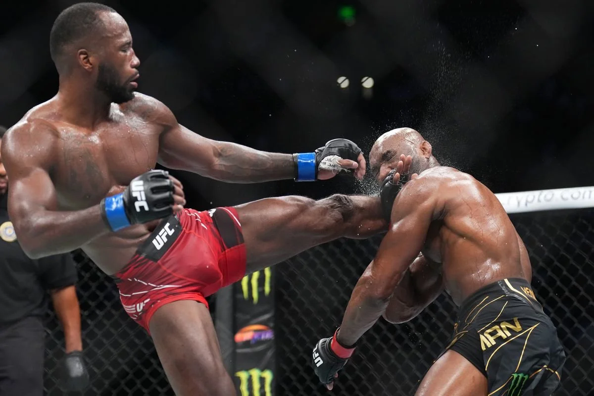Leon Edwards knocks out Kamaru Usman with a powerful head kick. Credit: Zuffa LLC.