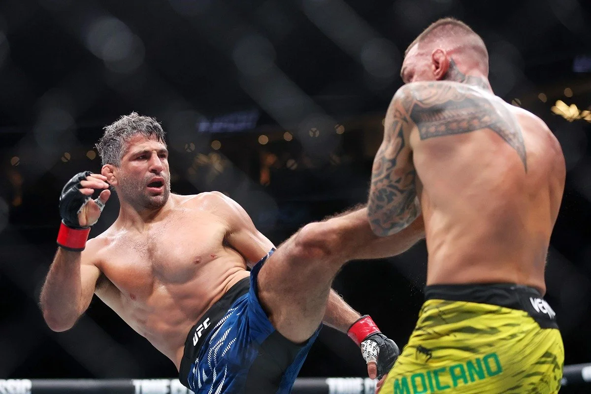Beneil Dariush fires a heavy kick at Renato Moicano. Credit: MMA Mania.