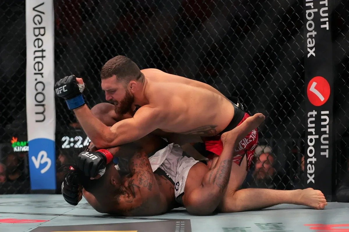 Jailton Almeida launches himself into Alexander Volkov to finish a takedown. Credit: Zuffa LLC.
