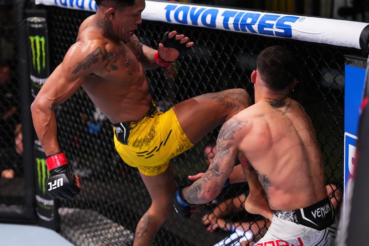 Vinicius Oliveira lands an incredible flying knee directly to the chin of Bernardo Sopaj. Credit: Zuffa LLC.