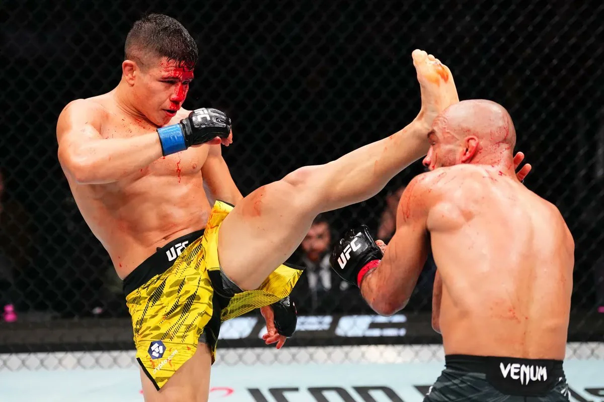 A bloodied Jean Matsumoto fires a kick to the head of Rob Font. Credit: Zuffa LLC.
