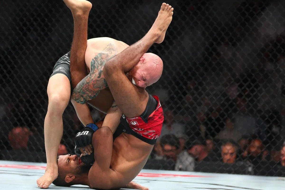 Marcus Buchecha looks to secure a kimura lock on Martin Buday. Credit: MMA Junkie.