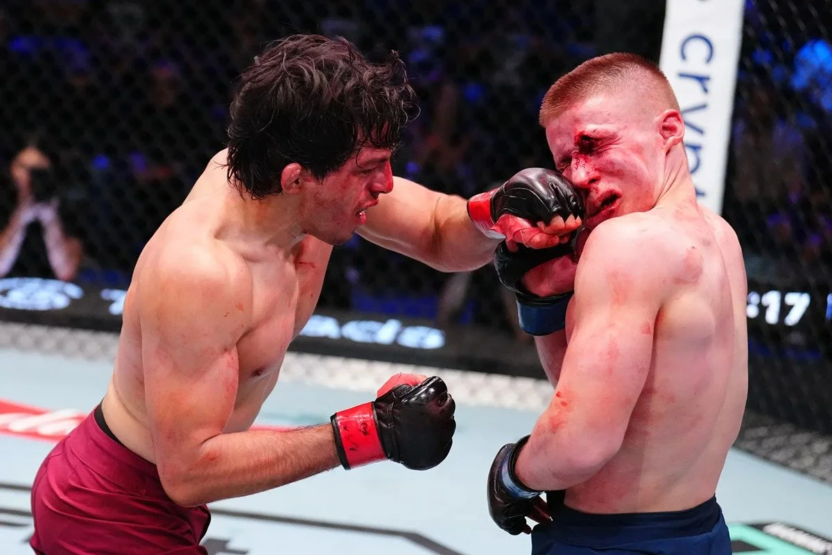 Adrian Luna Martinetti tags a battered Mark Vologdin with a stiff left hand. Credit: MMA Mania.