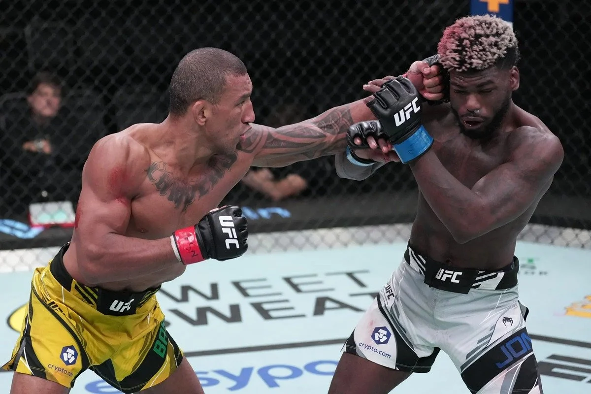 Raoni Barcelos pops Trevin Jones with a stinging left hand. Credit: MMA Fighting.