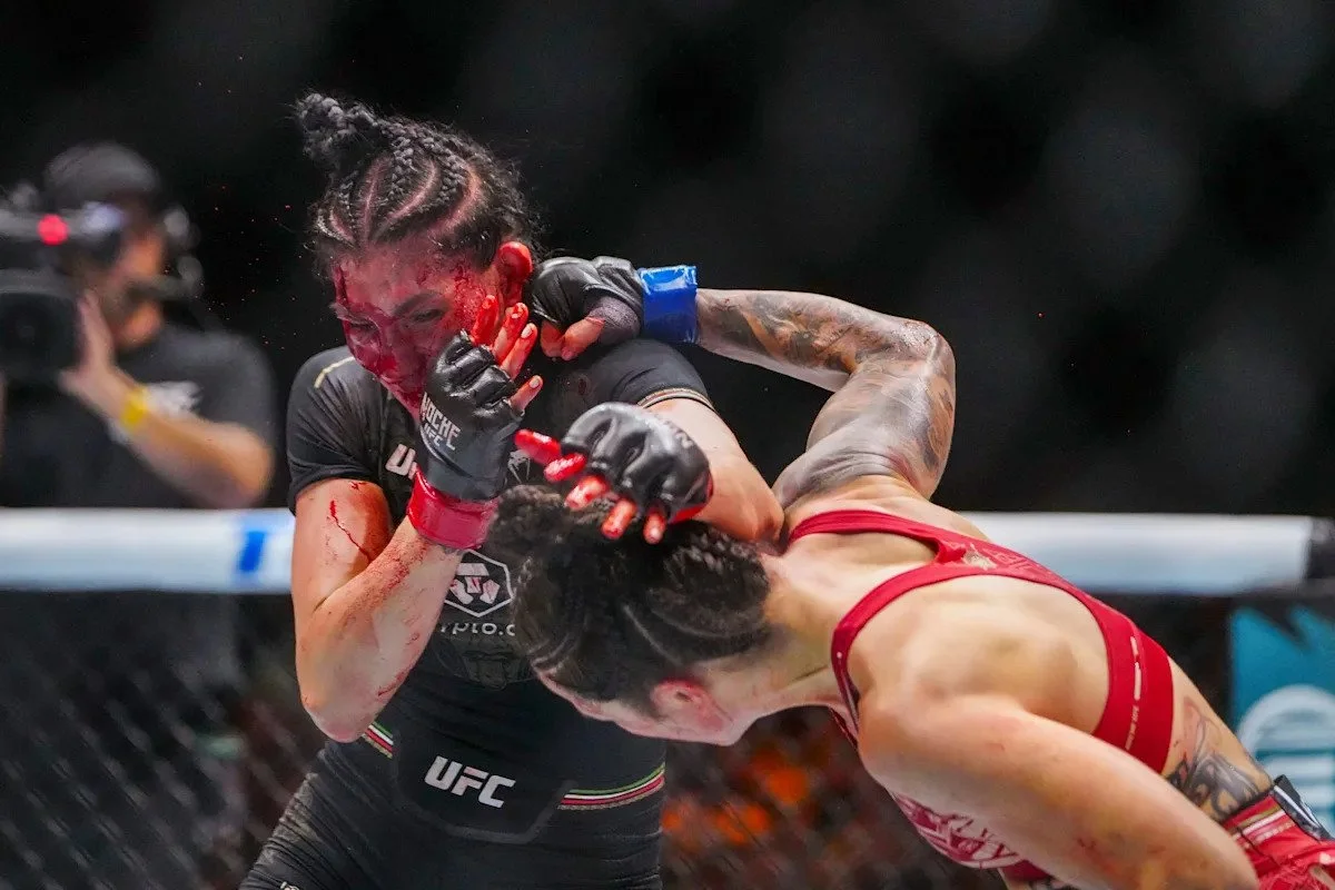 Norma Dumont lands a thudding overhand right on a bloodied Irene Aldana. Credit: MMA Fighting.