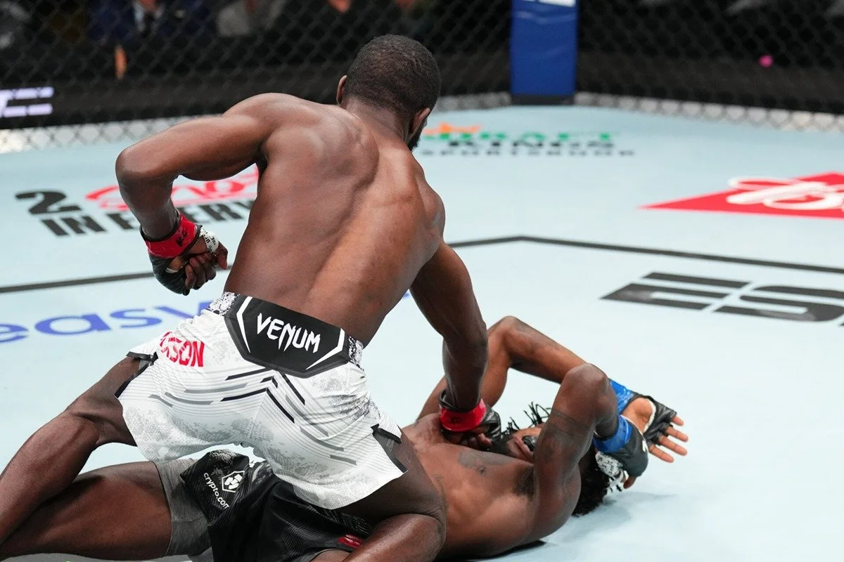 Montel Jackson finishes off Da’Mon Blackshear after flooring him with a straight left hand. Credit: Bloody Elbow.