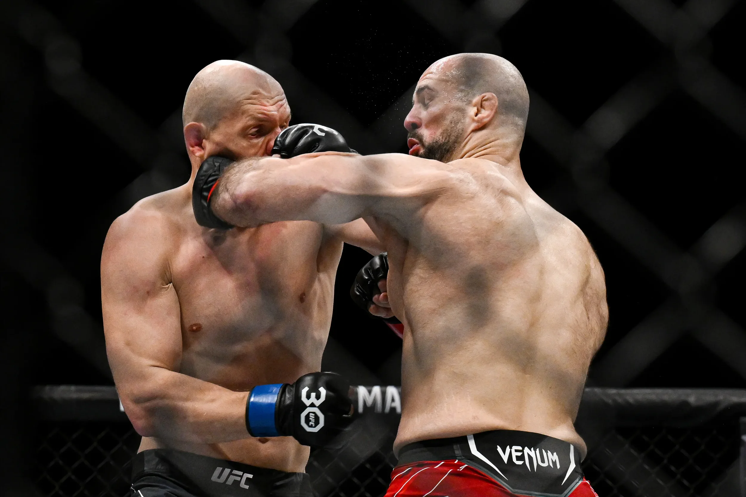 Volkan Oezdemir exchanges powerful blows with Bogdan Guskov. Credit: MMA Junkie.