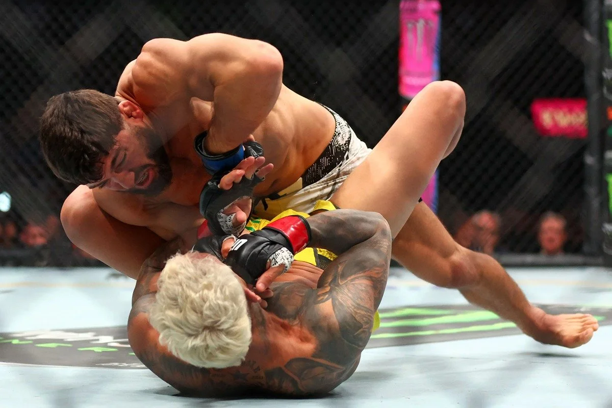 Arman Tsarukyan unloads a vicious ground and pound elbow onto Charles Oliveira. Credit: MMA Junkie.